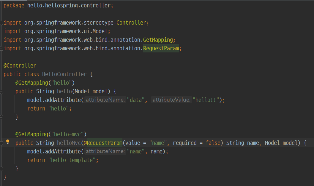 3. 있으면 해당 helloMvc()메소드를 호출하고, 이때 요청시 작성한 name='...'에 해당하는 파라미터를 인자로 넘기고 hello-template를 return 한다.