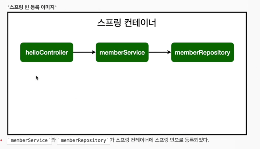 - `@Autowired`를 통한 DI는 `helloController`, `MemberService`등과 같이 스프링이 관리하는 객체에서만 동작한다. 스프링 빈으로 등록하지 않고 내가 직접 생성한 객체에서는 동작하지 않는다.