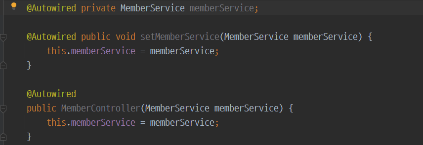 인자로 받은 memberService객체는 스프링 컨테이너가 앱 실행 시 생성해서 가지고 있는 객체를 인자로 주어 MemberController객체를 생성하게 된다.