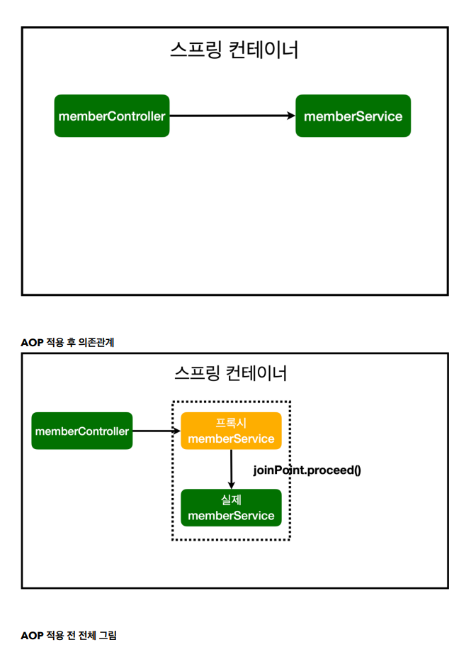 이때 AOP가 있으면, 프록시(가짜) 스프링 빈을 진짜 스프링 빈을 의존하도록 하고,
