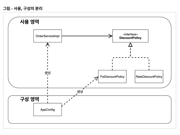 - AppConfig가 FixDiscountPolicy 객체 인스턴스를 클라이언트 코드 대신 생성해서 클라이언트 코드에 의존관계를 주입했다. 이렇게해서 DIP 원칙을 따르면서 문제도 해결했다.