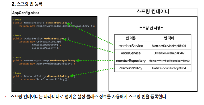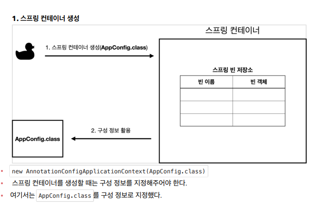 - 이전 챕터의 AppConfig를 사용했던 방식이 애노테이션 기반의 자바 설정 클래스로 스프링 컨테이너를 만든 것이다.
