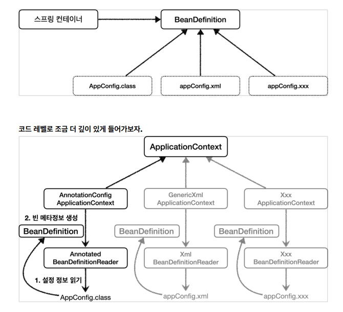 * 스프링 컨테이너는 자바 코드인지, XML인지 몰라도 된다. 오직 BeanDefinition만 알면 된다.