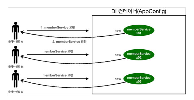 - 우리가 만들었던 스프링 없는 순수한 DI컨테이너인 AppConfig는 요청 시 객체를 새로 생성한다.