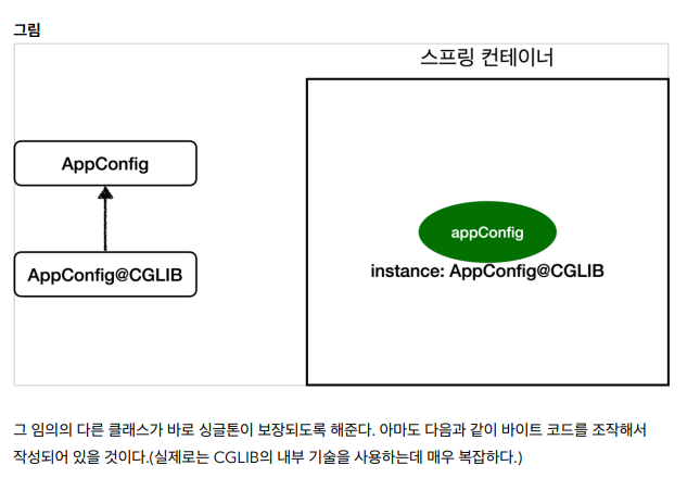 스프링 컨테이너는 싱글톤 레지스트리다. 따라서 스프링 빈이 싱글톤이 되도록 보장해주어야 한다. 그런데 스프링이 자바 코드 자체를 바꿔버리지는 않는다. 그래서 스프링은 클래스의 바이트코드를 조작하는 라이브러리를 사용한다. 모든 비밀은 @Configuration 을 적용한 AppConfig 에 있다.
