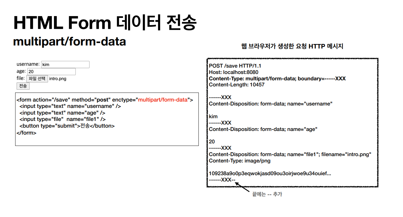 html에서 enctype을 설정해주면, 저렇게 웹브라우저가 HTTP메시지를 생성한다. 주로 binary 데이터 전송시 사용한다.